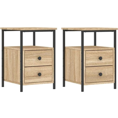 ManoManoGeneral description These bedside cabinets with an industrial style make a timeless addition to your interior decor. Technical specifications Colour: Sonoma oak Material: Engineered wood, iron Dimensions: 34 x 35.5 x 50 cm (L x W x H) Assembly required: Yes Delivery contains: 2 x Bedside cabinet Installation To prevent it from being overturned, this product must be used with the provided wall attachment device. Usage Ample storage space for keeping your various daily essentials well-organised and within easy reach. Displaying function: You can place your favourite photos, decorations, or flowers on top of the nightstand to enrich your life. Equipped with 4 adjustable feet that can protect your floor from scratches and keep it stable on uneven floors. Other information