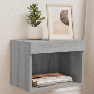 ManoManoGeneral description Featuring a trendy yet practical design, these bedside cabinets with LED lights will become a focal point of your room. The wall-mounted design helps maximize floor space while providing ample storage for magazines, remote controls, and other small items. The sturdy top is perfect for displaying decorative objects, photo frames, or potted plants. Technical specifications Material: Engineered wood Colour: Grey sonoma Dimensions: 40 x 30 x 30 cm (L x W x H) Power: DC 5V (USB power source not included) Assembly required: Yes Compatibility and accessories USB connector requires a certified 5V USB power source (not included) Screws and plugs for wall mounting are not included; use suitable screws and plugs for your walls Installation Please read and follow each step of the instructions carefully. If you're unsure about the installation, consult with a professional. Usage These bedside cabinets are designed for organizing small items and enhancing the aesthetic of your