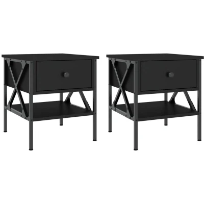 AmazonvidaXL Engineered Wood Bedside Tables in Black Finish, Pair of Industrial Themed Nightstands with Iron Frame for Bedrooms and Living Spaces