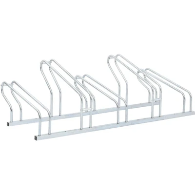 General description Utilize this bicycle stand to safely and efficiently park your bikes, saving valuable space. Made of galvanised steel, it is sturdy, corrosion-resistant, and lightweight for easy movement. The high-low wheel design accommodates five bikes without handlebar tangling, optimizing space for efficient parking. You can fasten the bicycle stand securely using the provided screws to prevent your bike from tipping or falling, ensuring stability. This bicycle stand is perfect for various settings, including garages, warehouses, schools, and shops. Technical specifications Colour: Silver Material: Galvanised steel Overall dimensions: 134 x 41 x 42 cm (L x W x H) Bicycle rack tube spacing: 55 mm Bicycle center spacing: 320 mm Can hold up to 5 bikes Mounting accessories included: 2 expansion screws and 2 ground screws Assembly required: Yes Other information
