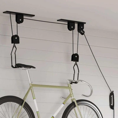 ManoManoGeneral description These bike hoists are ideal for cellars and garages, providing space-saving storage for bicycles, e-bikes, roof boxes, ladders, and kayaks. With a maximum loading capacity of 20 kg, they are designed to securely lift and store your equipment, keeping your space organized. Technical specifications Colour: Black Material: Steel Maximum ceiling height: 4 m Loading capacity: 20 kg Includes 2 nylon straps Integrated safety brake Mounting accessories included Assembly required: Yes Delivery contains: 2 x Bike hoist Other information