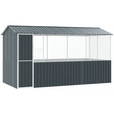 ManoManoGeneral description This bird cage is the perfect choice for providing a safe and stylish home for your feathered friends in gardens and terraces. Made from strong galvanized steel, it is designed to withstand various weather conditions while ensuring your birds remain snug and secure. With a spacious enclosure, your birds can flap their wings freely, reducing stress and enhancing their happiness. Technical specifications Colour: Anthracite Material: Galvanized steel Overall dimensions: 410 x 210 x 230 cm (L x W x H) Weight: 53.9 kg Durable: Yes Indoor / outdoor: Outdoor only Assembly required: Yes EAN: 8721158673800 SKU: 3325171 Brand: vidaXL Installation Easy assembly with a few tools and clear instructions. Ensure the product is built on a level surface. It is recommended to secure the product to an immovable object or to the ground. Do not install during extreme weather conditions such as strong winds or low temperatures. Keep children and pets away from the assembly area. Usage