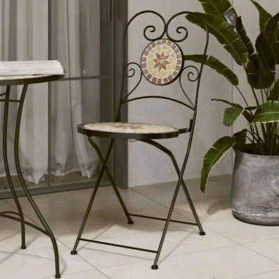 VidaXLThese bistro chairs, with a mosaic design, will become the focal point of your garden, balcony, or patio. Stable and easy-to-clean tabletop: These garden chairs have a ceramic top that is sturdy, durable, and easy to clean with a damp cloth.Robust and stable frame: The powder-coated iron frame ensures that the folding chairs are strong and stable for daily indoor or outdoor use.Foldable design: The bistro dining chair can also be folded to save space when not in use.Mosaic design: The outdoor chairs help create a Mediterranean atmosphere in your indoor or outdoor settings with the mosaic design. Good to know:To make sure your outdoor furniture stays beautiful, we recommend protecting it with a waterproof cover.
