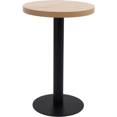 General description Create a romantic atmosphere with our elegant bistro table. The tabletop is made of MDF with a wood grain pattern and is supported by a sturdy steel leg and base. It is easy to clean with just a damp cloth and can be used as a single piece in your interior, restaurant, coffee shop, or bar. Assembly is straightforward. Technical specifications Colour: Light brown and black Material: MDF, steel Overall dimensions: 50 x 75 cm (Diameter x H) Thickness of table top: 3.8 cm Number of persons: 2 Assembly required: Yes Other information