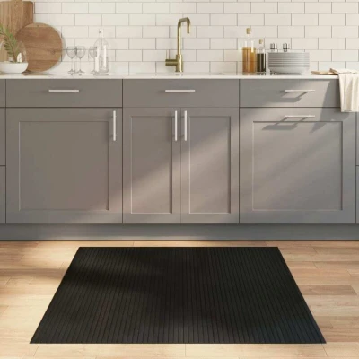 General description This modern bamboo rug in black will enhance the natural look of your living room and is a great addition to any decor. Technical specifications Colour: Black Material: Bamboo, PP (polypropylene) Size: 100 x 100 cm (W x L) Non-slip backing Usage Durable and long-lasting: Bamboo is a natural material known for its breathability and low odour, making it water-resistant and durable. Anti-slip backing: The rug is designed to stay firmly in place, reducing the risk of slipping. Easy to clean and store: The strong bamboo material allows for easy cleaning, and the rug can be rolled up for convenient storage and transport. Neutral tones: The rug's neutral tones blend well with various interior styles. Other information The bamboo is a natural product and may show imperfections. Width of bamboo slats may vary by +/- 1 mm, and small differences are common.