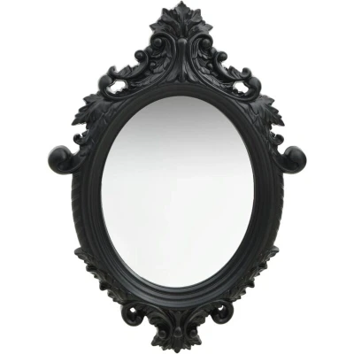 General description This beautifully designed wall mirror with an ornate frame creates a classic atmosphere in your dressing room. The antique-look mirror features a sturdy PU frame that is meticulously crafted in a decorative castle-style pattern. Additionally, the flat edge gives this mirror a unique look. The mirror is ready to be wall-mounted thanks to the already installed hook on the backboard. Technical specifications Colour: Black Material: Polyurethane, glass, and engineered wood Dimensions: 56 x 76 cm (L x W) Mirror shape: Oval With mounting hook Other information