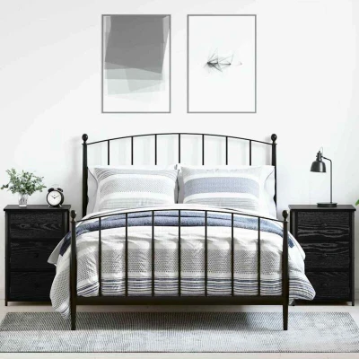 ManoManoGeneral description This modern bedside cabinet set includes two pieces, perfect for any bedroom with its sleek rectangular shape and tidy lines. Made from high-quality engineered wood and sturdy iron components, it provides a reliable surface for lamps, alarm clocks, or treasured items. Not only does it look great, but it also offers handy storage, making it ideal for those who value both style and practicality. Technical specifications Colour: Black oak Material: Engineered wood and iron Assembly required: Yes EAN: 8721288517753 SKU: 871262 Brand: vidaXL Installation Requires a screwdriver and two people for assembly. Usage Best used as a nightstand, suitable for tight spaces. Easy to clean with a damp cloth; avoid harsh chemicals. Other information