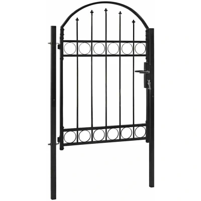 General description This fence gate will create a practical and stylish entryway, effectively secluding your garden from the outside world. With its elegant arched top design and robust horizontal braces, this garden gate not only enhances security but also adds a touch of sophistication to your property. Manufactured from heavy-duty steel and powder-coated to resist rust and corrosion, it combines style, strength, stability, and durability. Technical specifications Colour: Black Material: Steel with powder-coated finish Gate size: 104 x 125 cm (W x H) Post tube size: 40 x 40 x 1.5 mm (L x W x T) Equipped with lock and handle Includes 2 square posts with sturdy hinges for easy installation Other information