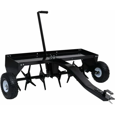 General description The lawn aerator for ride-on mowers is designed to easily and quickly loosen and aerate the lawn or upper soil. The roller features gears and holes that enhance ventilation for grass plants, allowing nutrients and fertilizers to penetrate the ground more effectively. For harder surfaces, additional weights (not included) can be added to increase the aerator's weight. Technical specifications Colour: Black Material: Steel Working width: 102 cm Tray capacity: 50 kg 24 replaceable coring points Single-hand lift lever Maximum ground penetration: 3 inches 2 pneumatic tires 24 galvanized sturdy pins Pneumatic tire size: 350-4 Weight: 31.5 kg Compatibility and accessories The aerator can be easily and safely connected to various vehicles, including: Ride-on mowers Lawn tractors ATVs Other information