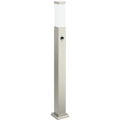 ManoManoGeneral description Enhance your outdoor space with this sleek and functional bollard light! Made from durable stainless steel and featuring an IP44 rating, this outdoor floor light is robust, weather-resistant, and perfect for long-term outdoor use. The built-in PIR (passive infrared) motion sensor detects movement with a 110° detection angle and an effective range of 8-12 meters, automatically turning on the light when motion is detected. Technical specifications Colour: Silver Material: Stainless steel Overall dimensions: 10 x 10 x 80 cm (W x D x H) Lampshade dimensions: 6 x 6 x 16 cm (W x D x H) IP rating: IP44 Power supply: 220-240 V~, 50/60 Hz Socket type: E27 (bulb not included) Maximum bulb power: 40 W Maximum power the socket can handle: 720 W Number of lamp holders: 1 With motion sensor: Yes Sensor type: Passive infrared motion sensor (PIR motion sensor) Movement detection angle: 110° Motion sensor's range: 8-12 meters Time setting: 10 seconds-5 minutes Suitable for outdoor