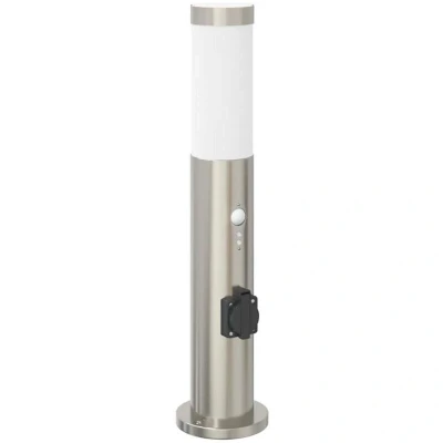 ManoManoGeneral description Enhance your outdoor space with this sleek and functional bollard light! Made from durable stainless steel, this outdoor floor light features an IP44 rating, making it robust and weather-resistant for long-term outdoor use. The built-in PIR motion sensor detects movement with a 120° angle and an effective range of 5-8 meters, automatically turning on the light when motion is detected. You can adjust the brightness sensitivity and set the lighting duration between 10 seconds and 5 minutes. Additionally, the garden light includes a built-in power socket for easy access to power for outdoor appliances. Technical specifications Colour: Silver Material: Stainless steel Overall dimensions: 11 x 50 cm (Diameter x Height) Lampshade dimensions: 7.5 x 16 cm (Diameter x Height) IP rating: IP44 Power supply: 220-240 V~, 50/60 Hz Socket type: E27 (bulb not included) Maximum bulb power: 40 W Maximum power the socket can handle: 720 W Number of lamp holders: 1 With outlet socket: