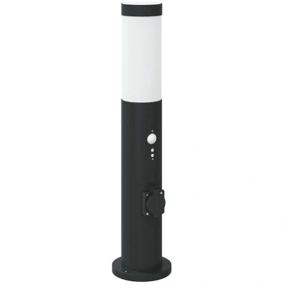 ManoManoGeneral description Enhance your outdoor space with this sleek and functional bollard light! Made from durable stainless steel, this outdoor floor light features an IP44 rating, making it robust and weather-resistant for long-term outdoor use. The built-in PIR motion sensor detects movement within a 120° angle and an effective range of 5-8 meters, automatically turning on the light when motion is detected. You can also adjust the brightness sensitivity and set the lighting duration between 10 seconds and 5 minutes. Additionally, the garden light includes a built-in power socket for easy access to power for outdoor appliances. Technical specifications Colour: Black Material: Stainless steel Overall dimensions: 11 x 50 cm (Diameter x Height) Lampshade dimensions: 7.5 x 16 cm (Diameter x Height) IP rating: IP44 Power supply: 220-240 V~, 50/60 Hz Socket type: E27 (bulb not included) Maximum bulb power: 40 W Maximum power the socket can handle: 720 W Number of lamp holders: 1 With outlet