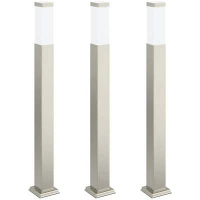 General description Enhance your outdoor space with these sleek and functional bollard lights! Made from durable stainless steel with an IP44 rating, these lights are robust, weather-resistant, and perfect for long-term outdoor use. The included plastic diffuser protects the light source from dust, water, and debris while providing an even and diffused light output. These stylish patio floor lights improve safety by illuminating your outdoor areas, minimizing tripping hazards, and enhancing your outdoor decor. Technical specifications Colour: Silver Material: Stainless steel Overall dimensions: 10 x 10 x 80 cm (W x D x H) Lampshade dimensions: 6 x 6 x 16 cm (W x D x H) IP rating: IP44 Power supply: 220-240 V~, 50/60 Hz Socket type: E27 (bulb not included) Maximum bulb power: 40 W Number of lamp holders: 1 With outlet socket: No With motion sensor: No Suitable for outdoor use Delivery contains: 3 x Bollard light Other information