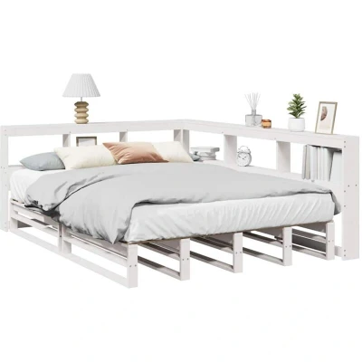 ManoManoGeneral description Get a better restful night's sleep with this stylish bookcase bed! It makes a welcoming addition to any bedroom, combining functionality with rustic charm. Technical specifications Colour: White Material: Solid pinewood Overall dimensions: 208.5 x 158.5 x 80 cm (L x W x H) Bed frame dimensions: 190 x 140 x 25.5 cm (L x W x H) Suitable mattress size: 140 x 190 cm (W x L) (mattress not included) With slatted base Bookcase headboard dimensions: 208.5 x 158.5 x 80 cm (L x W x H) Suitable for mattress width: 140 cm Assembly required: Yes Compatibility and accessories A mattress is not included with this bed. Various selections of mattresses are available in our shop. Installation Flexible assembly options allow you to place the long side of the headboard on either the left or right side to match your bedroom space. Usage The headboard features built-in storage to keep books, decorative items, and essentials organized and within reach. This L-shaped headboard fits snugly
