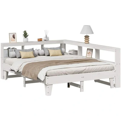 ManoManoGeneral description Get a better restful night's sleep with this stylish bookcase bed! It makes a welcoming addition to any bedroom, combining functionality with rustic charm. Technical specifications Colour: White Material: Solid pinewood Overall dimensions: 218.5 x 168.5 x 80 cm (L x W x H) Bed frame dimensions: 203.5 x 153.5 x 36 cm (L x W x H) Suitable mattress size: 150 x 200 cm (W x L) (mattress not included) With slatted base Bookcase headboard dimensions: 218.5 x 168.5 x 80 cm (L x W x H) Suitable for mattress width: 150 cm With storage shelves L-shaped design Compatibility and accessories A mattress is not included with this bed. Various selections of mattresses are available in our shop. Installation Assembly required: Yes Two assembly ways: The bookcase headboard offers flexible assembly options, allowing placement of its long side on either the left or right side to match your bedroom space. Usage Ample storage space: The headboard features built-in storage to keep books,