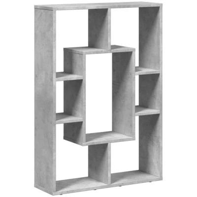 ManoManoGeneral description The contemporary bookcase in concrete grey features a geometric design that combines style with functionality, making it perfect for organizing your space. With ample storage options and a versatile layout, it can serve various purposes in your home. Technical specifications Colour: Concrete grey Material: Engineered wood Overall dimensions: 63 x 20 x 90 cm (W x D x H) Number of compartments: 7 Overall load capacity: 60 kg Assembly required: Yes Installation To prevent tipping, use the provided wall attachment device. Screws and plugs for wall attachment are not included; choose suitable ones for your wall type. Follow the assembly instructions carefully for best results. Usage This versatile shelving unit can be used in various ways: As a room divider In the living room for displaying decorations In the study for storing books and documents In the bedroom for everyday items In the basement for miscellaneous storage Other information