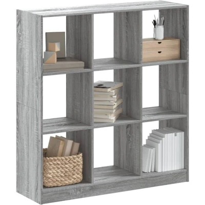 General description This bookcase is a great helper to showcase your treasured belongings while also keeping them perfectly arranged and easily accessible. It is designed with 9 compartments, providing ample space to display your books, family photos, potted plants, and more, making your space more elegant and tidier. Technical specifications Colour: Grey sonoma Material: Engineered wood Overall dimensions: 102 x 32 x 108 cm (W x D x H) Compartment dimensions (each): 32 x 32 x 32 cm (W x D x H) Max. load capacity (each layer): 10 kg Assembly required: Yes Installation To prevent it from tipping over, this product must be used with the provided wall attachment device. Usage Thanks to its smooth surface, the bookshelf is easy to clean with a damp cloth and requires less maintenance. This compact book rack is versatile and ideal for small spaces including living rooms, bedrooms, offices, kitchens, etc. Other information