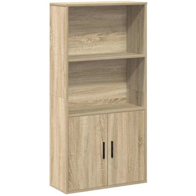 ManoManoGeneral description This bookcase offers the perfect solution for organizing your books while serving as a stylish and functional addition to your home decor. It features two shelves and two compartments with doors, providing ample space for keeping your collection of books, magazines, and documents in good order. The practical door ensures enclosed storage space to keep your belongings organized, protected, and out of sight. This bookcase is ideal for your book collection and can also be used as a display shelf for your collections, photos, awards, potted plants, etc. Thanks to its smooth surface, the cabinet is easy to clean with a damp cloth and requires less maintenance. Technical specifications Colour: Sonoma oak Material: Engineered wood Overall dimensions: 60 x 24 x 120 cm (W x D x H) Shelf dimensions (each): 57 x 24 x 33.5 cm (W x D x H) Compartment dimensions (each): 28 x 24 x 47 cm (W x D x H) Assembly required: Yes Installation To prevent it from tipping over, this product