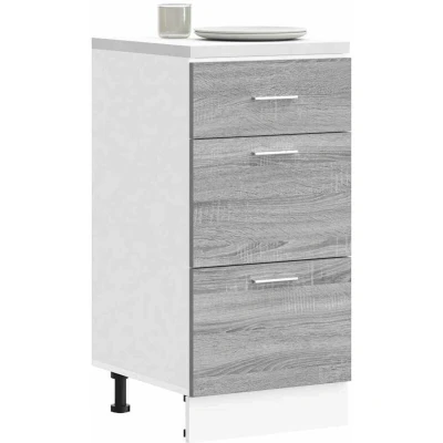 General description This bottom cabinet optimizes your kitchen space, providing ample storage for your personal belongings. The kitchen cabinet offers sufficient space to store bowls, plates, pots, and other kitchen appliances. It features adjustable feet that can be modified in height to suit your kitchen layout, and its smooth surface makes it easy to clean with a damp cloth, requiring less maintenance. Technical specifications Colour: Grey sonoma Material: Engineered wood Overall dimensions: 40 x 46 x 81.5 cm (W x D x H) Maximum load capacity (total): 50 kg Maximum load capacity (top board): 30 kg Maximum load capacity (per drawer): 5-8 kg Assembly required: Yes Other information Warning: To prevent tipping, this product must be used with the provided wall attachment device. The worktop is not included in the delivery. SKU: 854216