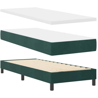 ManoManoGeneral description The Box Spring Bed with Mattress combines modern style and exceptional comfort, making it an ideal choice for any contemporary bedroom. With its sleek lines and minimalist design, this bed exudes sophistication and complements various room styles. Crafted for quality and durability, it serves as a stylish and comfortable centerpiece for both city apartments and suburban homes. The luxurious velvet finish invites relaxation while seamlessly integrating with your existing furniture. Technical specifications Colour: Dark green Material: Velvet Frame material: Engineered wood Overall dimensions: 203 x 81.5 x 24 cm (L x W x H) Mattress size: Small single Has slatted frame: Yes Max number of people: 1 Height-Adjustable: Yes Durable: Yes Mattress material: Foam Assembly required: Yes Delivery contains: 1x Bed frame, 1x Mattress, 1x Mattress topper, 1x Headboard with ears EAN: 8721288304346 SKU: 3341387 Brand: vidaXL Usage Perfect for bedrooms aiming for subtle