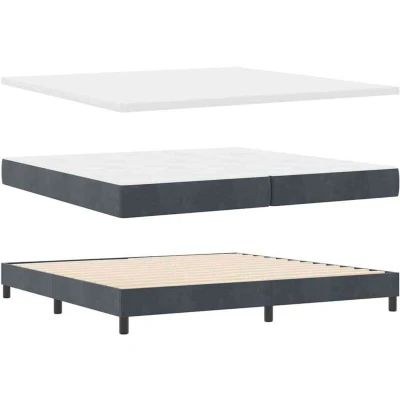 ManoManoGeneral description The Box Spring Bed with Mattress combines modern style and exceptional comfort, making it an ideal choice for any contemporary bedroom. With its sleek lines and minimalist design, this bed exudes sophistication and complements various room styles. Crafted for quality and durability, it serves as a stylish and comfortable centerpiece for both city apartments and suburban homes. The luxurious velvety texture invites relaxation while seamlessly integrating with your existing furniture. Technical specifications Colour: Dark grey Material: Velvet Frame material: Engineered wood Overall dimensions: 204 x 202.5 x 24 cm (L x W x H) Mattress size: Super king Has slatted frame: Yes Max number of people: 3 Height-Adjustable: Yes Durable: Yes Mattress material: Foam Assembly required: Yes EAN: 8721288305343 SKU: 3341487 Brand: vidaXL Compatibility and accessories Includes: 1x Bed frame 1x Mattress 1x Mattress topper 1x Headboard with ears Installation Assembly required: Yes