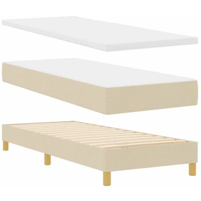 ManoManoGeneral description This Box Spring Bed with Mattress in cream is a true gem of modern simplicity and practicality. It's a great pick for bedrooms that want a minimal yet classy vibe. The woven texture and soft finish bring in a warm atmosphere that fits right into different decor styles. The cream fabric adds a cozy touch, creating a chill space that's perfect for relaxing and recharging. Technical specifications Colour: Cream Material: Fabric Frame material: Engineered wood Overall dimensions: 204.5 x 81.5 x 23.5 cm (L x W x H) Mattress size: Small single Has slatted frame: Yes Max number of people: 1 Mattress material: Foam Assembly required: Yes EAN: 8721158222930 SKU: 3340246 Brand: vidaXL Included Components 1 bed frame 1 mattress 1 mattress topper 1 headboard with ears Features / Function / Design Adjustable headboard for ideal sleeping angle Clean lines and durable fabric for a modern flair Recommended Uses Perfect for bedrooms Ideal for personal relaxation or accommodating