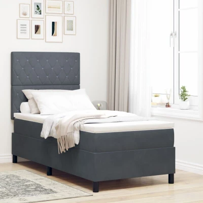 ManoManoGeneral description The Box Spring Bed with Mattress is an excellent choice for enhancing the style and comfort of your bedroom. Its modern design seamlessly fits into any home, providing a fresh and clean look. With a cleverly engineered design, this bed offers a plush sleeping area without compromising on style. The sleek velvet headboard and integrated lighting create a perfect balance between aesthetics and functionality, making it inviting and easy to use. Technical specifications Colour: Dark grey Material: Velvet Frame material: Engineered wood Overall dimensions: 193 x 93 x 128 cm (L x W x H) Mattress size: Single Max weight: 140 kg Has slatted frame: Yes Max number of people: 1 Mattress material: Foam Headboard Size: 190 x 7 x 128 cm (W x D x H) Lights type: LED strip lights Assembly required: Yes EAN: 8721288322623 SKU: 3343215 Brand: vidaXL Included Components 1x Bed frame 1x Headboard 1x Mattress 1x Mattress topper 1x LED strip Care & Maintenance Maintaining this bed is