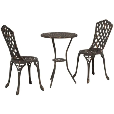 ManoManoGeneral description This Garden Bistro Set mixes classic style with solid practicality, perfect for enjoying the outdoors. Built with high-grade aluminium, it creates a welcoming spot for gardens, patios, or terraces, making it ideal for get-togethers, quiet mornings, or laid-back evenings. Technical specifications Colour: Bronze Material: Aluminium Durable and weather-resistant Assembly required: Yes Delivery contains: 1 x Table, 2 x Chairs EAN: 8721158863041 SKU: 42002390 Assembly & Care Simple assembly requires two people with a screwdriver. To keep it in top shape, cover it when not in use, so it stays pristine through sunny or rainy days. Other information