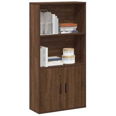 ManoManoGeneral description This bookcase offers the perfect solution for organizing your books while serving as a stylish and functional addition to your home decor. It features two shelves and two compartments with doors, providing ample space for keeping your collection of books, magazines, and documents in good order. The practical door ensures enclosed storage space to keep your belongings organized and out of sight. This bookcase is ideal for your book collection and can also be used as a display shelf for your collections, photos, awards, potted plants, etc. Thanks to its smooth surface, the cabinet is easy to clean with a damp cloth and requires less maintenance. Technical specifications Colour: Brown oak Material: Engineered wood Overall dimensions: 60 x 24 x 120 cm (W x D x H) Shelf dimensions (each): 57 x 24 x 33.5 cm (W x D x H) Compartment dimensions (each): 28 x 24 x 47 cm (W x D x H) Assembly required: Yes SKU: 860424 Installation To prevent it from tipping over, this product