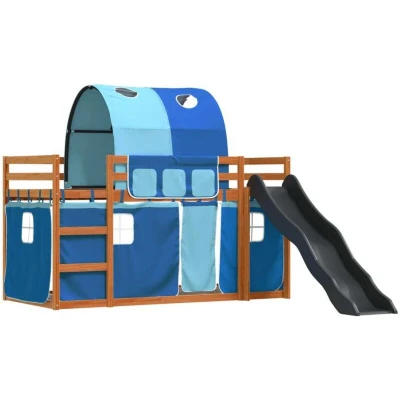 ManoManoGeneral description This wooden bunk bed is elegant and functional, making it a perfect addition to any room with limited space. Made of solid pine wood, it offers stability and durability while providing a rustic look with its straight grain and knots. The bunk bed features a fun slide, safety guardrails, and sturdy slats for a comfortable sleeping experience. Technical specifications Bed frame colour: Wax brown Slide colour: Anthracite Bed frame material: Solid pine wood Overall dimensions (without slide): 205.5 x 97.5 x 113 cm (L x W x H) Slide dimensions: 169 x 38.5 x 20.5 cm (L x W x H) Distance between slide and bed: 143.5 cm Suitable mattress size: 90 x 200 cm (W x L) (mattress not included) Maximum thickness of the mattress: 10 cm Suitable for children aged 6 years and above Curtain set colour: Blue Curtain material: 100% Polyester Only for indoor use Assembly required: Yes Compatibility and accessories A mattress is not included with this bed, but a selection of mattresses is