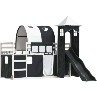 ManoManoGeneral description This wooden bunk bed is both elegant and functional, making it an ideal choice for rooms with limited space. Crafted from solid pine wood, it offers stability and durability while adding a rustic charm to your child's bedroom. The bunk bed features a fun slide, safety guardrails, and a convenient ladder, transforming bedtime into an exciting adventure. Technical specifications Bed frame colour: White Slide colour: Anthracite Bed frame material: Solid pine wood Overall dimensions (without slide): 205.5 x 87.5 x 113 cm (L x W x H) Slide dimensions: 169 x 38.5 x 20.5 cm (L x W x H) Distance between slide and bed: 143.5 cm Suitable mattress size: 80 x 200 cm (W x L) (mattress not included) Maximum thickness of the mattress: 10 cm Suitable for children aged 6 years and above Curtain set colour: White and black Curtain set material: 100% Polyester Assembly required: Yes Usage This bunk bed is designed for children aged 6 years and above. It is perfect for creating a