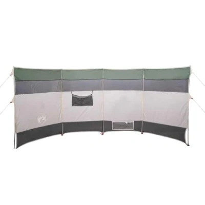 This camping windbreak is a portable barrier that helps protect against strong winds and creates a more comfortable outdoor space. All-round waterproof design: This camping windbreaker, made from polyester with a PU coating, is waterproof and wind resistant.Multi-functional: The wind fence has a mesh window on each panel. Although the windows provide a great view of your surroundings, they’re positioned at a height that helps to maintain your privacy.Stable and safe: Metal stakes and guy ropes provide secure anchoring for the camping fence, ensuring stability even on windy days at the beach or campsite.Easy setup and takedown: Setting up and taking down the beach windbreak is a breeze thanks to the highly flexible and lightweight fibreglass poles and the convenient pin-and-ring connection system. Warning:Keep all flame and heat sources away from this product fabric.