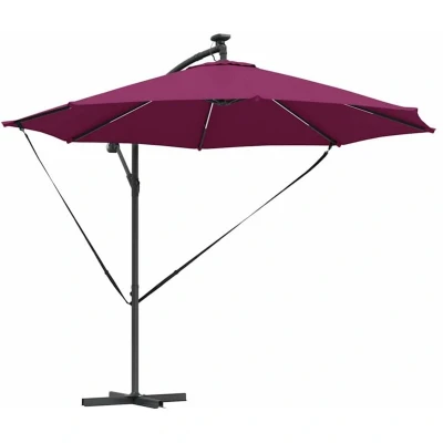 ManoManoGeneral description This cantilever sun shade adds a stylish vibe to outdoor areas like balconies, gardens, and terraces. It boosts comfort and protection on sunny days with its sleek look, smooth surface, and powder-coated finish, plus a UV-protective polyester cover. If you like style as much as function, this umbrella fits in nicely with your outdoor settings. Picture yourself enjoying gatherings or peaceful afternoons under this wide shade, transforming any space, deck, or trendy patio into something special. Technical specifications Colour: Bordeaux red Material: Powder-coated steel Overall dimensions: 294 x 294 x 248 cm (L x W x H) Tiltable Solar-powered LED lights on each rib Water-resistant finish Assembly required: Yes EAN: 8721158863898 SKU: 42003389 Brand: vidaXL Installation Assembly required: Yes Usage Adjustable Hand Crank: With a slick hand crank, you can open and close this sun shade easily. Manual operation allows you to adjust the height for optimal sun coverage.