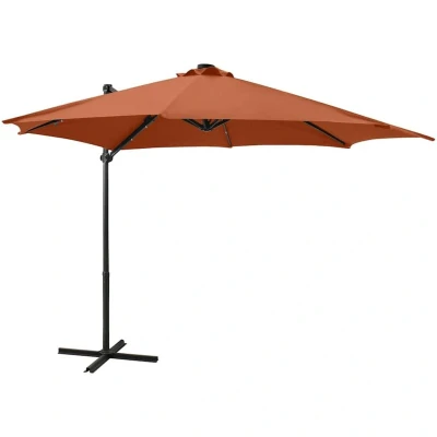General description This elegant cantilever garden parasol with LED lights is an excellent choice for creating shade and protection from the sun's harmful UV rays. When the sun goes down, the LEDs will illuminate your outdoor living space, creating a cozy and romantic ambiance. Technical specifications Colour: Terracotta Material: Fabric with a PA coating, aluminium Overall dimensions: 300 x 238 cm (Diameter x H) Cross base size: 100 x 100 cm (L x W) Features: air vent and crank system Tilting and 360-degree rotating design Includes: 8 aluminium ribs, 24 LED lights, solar cell Assembly required: Yes Installation Ensure that this product is fully assembled as illustrated before use. Do not completely tighten each screw until all screws are properly fixed. It is important to re-tighten any screws 2 weeks after assembly and once every 3 months to ensure stability. Keep children out of the assembly area during assembly. Handle heavy parts with care. Usage This product should only be used