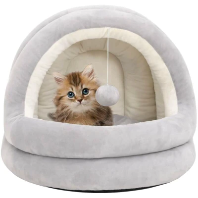 General description Give your furry friends a taste of luxury with this cat bed! It is an excellent spot for your cats to relax and rest. The thickly padded cat house is made of soft fleece, providing a comfortable and warm place for your beloved little friends. Additionally, the cat bed features non-slip underside padding, which keeps it firmly in place and avoids any accidents. This cat bed is easy to clean and wipe, and it includes a hanging ball for extra fun. Important note: Please confirm the size is suitable for your pets before purchase. Technical specifications Colour: Grey and cream Material: Fleece Filling material: PP cotton Dimensions: 50 x 50 x 45 cm (W x D x H) Inner size: 20 x 37 cm (W x D) Note: Size tolerance +/- 2 cm SKU: 171398 Other information