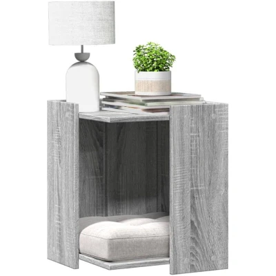 ManoManoGeneral description Give your cat a cosy private space with the cat litter box enclosure while keeping the style of your home consistent. This enclosure allows you to hide a litter box or cat bed inside, keeping your home tidy and seamlessly blending with your space. The litter box furniture not only serves as a cosy cat house but also functions as a side table, while the top platform provides an ideal space for displaying photo frames, plants, and other small decorative items. Its compact size and innovative construction make it perfect for small living spaces, combining a cat bed with a side table without taking up additional floor area. Technical specifications Colour: Grey sonoma Material: Engineered wood Overall dimensions: 42 x 42 x 51 cm (W x D x H) Interior dimensions: 37 x 37 x 42 cm (W x D x H) Total load capacity: 70 kg Max. load capacity of top surface: 40 kg Assembly required: Yes Usage Thanks to its smooth surface, the cat house is easy to clean with a damp cloth and