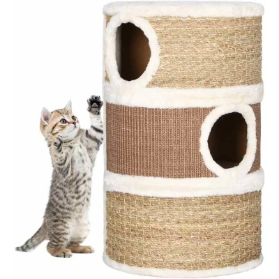General description This charming cat scratching barrel offers your cat plenty of ways to play and sharpen its claws. The roomy barrel is particularly suited to large cat breeds, providing enough space for your cats to hide away, perch, climb, and relax. It includes 3 large openings for easy access to the higher level. The seagrass coverage allows your cats to sharpen their claws and protects your furniture from damage, while the soft plush on the inside provides ultimate comfort for your furry friends. Technical specifications Colour: Brown Material: Flakeboard, plush, seagrass Dimensions: 36 x 60 cm (Diameter x H) Outer opening diameter: 13.5 cm Includes 3 condos Other information