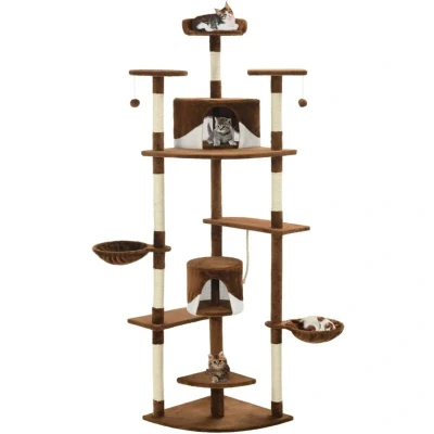 General description Give your feline friends a taste of luxury with our feature-packed cat tree! This multi-storey cats' play centre, with a solid frame covered in soft, comfortable plush, is the perfect retreat for your cats to scratch, climb, perch, hide, and rest. Your feline friends can sharpen their claws on the scratching posts wrapped in sisal rope, which provides a healthy outlet for their scratching instincts. They will also enjoy chasing after each other while jumping up and down this fun play centre. At the top of the cat tree, there are two dangling toys that will engage your curious cats. When they've had enough playtime fun, your little friends will love resting on the upper platforms where they have a better view. They can also hide in the cosy houses to take a nap or take a load off on the comfy baskets. With all these fun features, this cat playhouse will become your furry friends' favourite hangout spot! Technical specifications Colour: Brown and white Material: