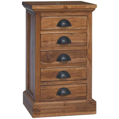 This vintage-style chest of drawers offers an exquisite blend of form and function, making it a charming addition to any living or bedroom space. Meticulously crafted from solid teak wood, this piece promises durability while infusing your home with warmth and timeless elegance. Its finely sanded finish enhances the wood's natural grain, providing a sophisticated look that complements a vintage-inspired or contemporary decor. With ample storage capabilities, it is the ideal solution for those who seek to organize their space in style. Solid Teak Construction Each drawer and frame is made from solid teak wood, ensuring remarkable durability and a long-lasting piece that stands the test of time. The natural teak properties resist wear, and its inherent elegance fits seamlessly into varied interior decor themes. Compact and Efficient Designed to maximize your living space, this chest of drawers has a rectangular shape that adapts to corners and tight spaces without compromising storage capacity. Ideal for apartments or rooms where a compact but efficient storage solution is needed. Stylish Cup Pulls This elegant piece features cup pull handles made from black metal, providing both a comfortable grip and a striking contrast to the warm brown hue of the teak. The unique design of the handles complements the vintage aesthetic while ensuring user-friendly operation. Versatile Use Whether placed in a bedroom, living room, or hallway, this drawer set adapts to any space, offering significant storage for miscellaneous items. Its versatile design allows for a seamless transition between different parts of the house. Care Instructions Maintain its elegant look with easy cleaning practices. Avoid harsh abrasives; a gentle cloth will keep its smooth surface pristine, ensuring the longevity of the fine sanded finish.