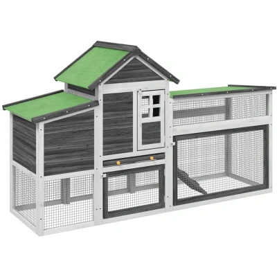 ManoManoGeneral description The wooden chicken coop provides a cozy and comfortable place for keeping small animals, especially chickens, to relax. Made from solid pine wood, it features a beautiful natural material with a straight grain and rustic knots. This all-in-one chicken run includes a large nesting box, resting area, and run ramp, ensuring ample space for chickens to roam freely. The coop is equipped with breathable wire fences to protect the animals from outside predators and has a water-resistant roof that keeps pets warm, dry, and safe. Technical specifications Material: Solid pine wood, plywood Dimensions: 186.5 x 58.5 x 113 cm (L x W x H) Color: Grey Features a pull-out tray Assembly required: Yes Other information