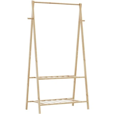 ManoManoGeneral description The bamboo clothes rack provides a natural solution for organizing your space, combining practical design with sturdy functionality. It features a hanging rod for clothes, an upper shelf for boxes and folded garments, and a lower shelf for shoes. Additionally, side hooks offer a convenient place to hang handbags and hats. Technical specifications Material: Bamboo with a varnished finish Shelf material: Fabric Dimensions: 96 x 45.5 x 150.5 cm (W x D x H) Width of coat hook (each): 8 cm Number of shelves: 2 Number of coat hooks: 2 Max. weight capacity of hanging rod: 9 kg Max. weight capacity per shelf: 10 kg Max. weight capacity per hook: 5 kg Foldable: Yes Assembly required: Yes Other information