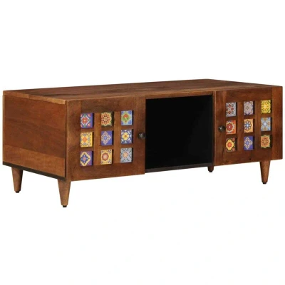 ManoManoThis exquisite coffee table is crafted from premium solid Mango wood, offering a warm brown hue that beautifully complements any living space. Its rectangular shape and natural finish bring a touch of elegance to living rooms, creating a cozy atmosphere. Designed as a multifunctional piece, this table seamlessly supports beverages, books, and decorative items, earning its place as an essential centerpiece for gatherings and relaxation.Including a hinge door system, the table offers substantial hidden storage, perfect for keeping your living space tidy. Its solid construction ensures durability while maintaining an aesthetic appeal that suits both contemporary and traditional settings. Ideal for those who appreciate quality craftsmanship, this coffee table is a reflection of both functionality and timeless design. Materials: Constructed from solid Mango wood, this table showcases the richness of natural textures and grain patterns, providing a durable structure that withstands daily