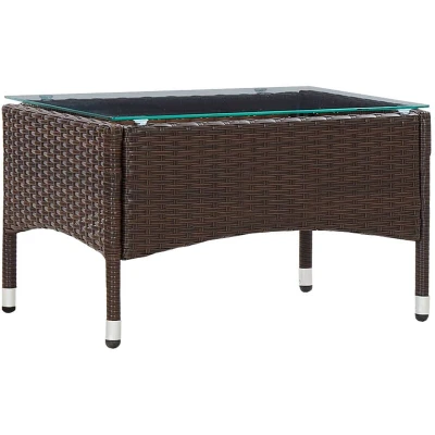 ManoManoGeneral description This coffee table, with a unique design, will instantly add a touch of style to your living space. Made of weather-resistant PE rattan, this garden table is easy to clean, hard-wearing, and suitable for daily use. The table is easy to move around to suit any setting and can also be used as a side table, coffee table, end table, or couch table. Our coffee table is easy to assemble. Technical specifications Colour: Brown Material: PE rattan, glass Dimensions: 60 x 40 x 36 cm (L x W x H) Weather resistant Easy to clean Assembly required: Yes Other information