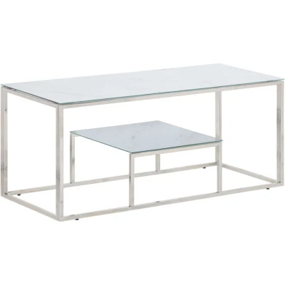 General description Combining functionality and beauty, this coffee table will be the focal point of your room. The table features a glass top that provides a visible and ample surface for snacks, drinks, vases, fruit bowls, or other decorative items. Its sturdy stainless steel frame ensures stability, while the stain-resistant surface allows for easy maintenance, keeping the table looking its best. The simple and modern design complements any room decor. Technical specifications Frame colour: Silver Material: Stainless steel, tempered glass with white marble finish Dimensions: 110 x 45 x 45 cm (L x W x H) Tempered glass thickness: 6 mm Assembly required: Yes Other information