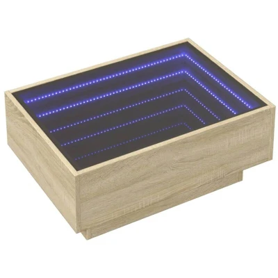 VidaXLThe unique coffee table with an LED infinity mirror is suitable for different places. It's a must-have table in your house. Stable and durable material: Engineered wood is a durable and stable material with a smooth surface that is resistant to moisture, warping, and splitting, making it a reliable choice for a variety of projects.RGB LED lights for a pleasant ambience: This coffee table features LED lights that can be easily adjusted to create a personalised light show, enhancing your interior space's ambience.Sturdy tabletop: The sturdy tabletop of the living room table is perfect for placing your drinks, food and other decorative items.Multiple applications: This coffee table serves multiple purposes. It can function as a side table, end table, or couch table in your living room or bedroom, catering to your specific needs. Good to know:The product has a USB connector that requires a certified 5V USB power source (not included).