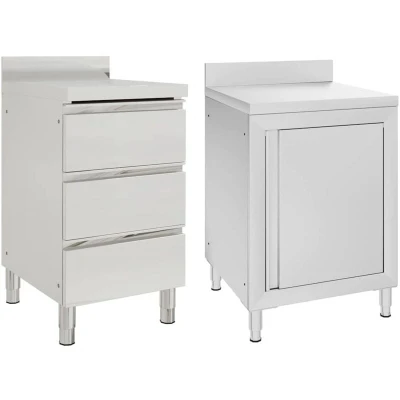 General description If you want to keep your kitchen supplies organized, the commercial kitchen cabinet is a perfect choice. It can be widely used in restaurants, hotels, food production, gastronomy, garages, workplaces, and home use. Made of quality stainless steel, the storage cabinet is robust, anti-corrosive, and easy to clean. The cabinet provides ample storage space for cleaning equipment and accessories. Additionally, the adjustable feet keep the cabinet level on uneven floors. The 10 cm backsplash and water pipe hole are also included. Technical specifications Colour: Silver Material: Stainless steel Cabinet 1 Dimensions: 50 x 60 x (95-96) cm (W x D x H) Cabinet 2 Dimensions: 60 x 60 x (95-96) cm (L x W x H) Food grade stainless steel 3 drawers with smooth rails Assembly required: Yes Compatibility and accessories Includes a compartment for storage Assembling accessories are included in the delivery Can be connected with other cabinets such as commercial sink cabinet and