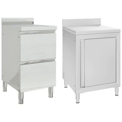 General description If you want to keep your kitchen supplies organized, the commercial kitchen cabinet is a perfect choice. It can be widely used in restaurants, hotels, food production, gastronomy, garages, workplaces, and home use. Made of quality stainless steel, the storage cabinet is robust, anti-corrosive, and easy to clean. The cabinet provides ample storage space for cleaning equipment and accessories. Additionally, the adjustable feet keep the cabinet level on uneven floors. The 10 cm backsplash and water pipe hole are also included. Technical specifications Colour: Silver Material: Stainless steel Cabinet 1 Dimensions: 50 x 60 x (95-96) cm (W x D x H) Cabinet 2 Dimensions: 60 x 60 x (95-96) cm (L x W x H) 2 drawers with smooth rails Food grade stainless steel Assembly required: Yes Compatibility and accessories Includes a compartment for storage Assembling accessories are included in the delivery Can be connected with other cabinets such as commercial sink cabinet and
