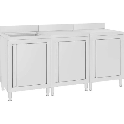 General description This commercial kitchen sink cabinet is an ideal choice for maintaining cleanliness in various settings such as restaurants, hotels, food production areas, garages, workplaces, and homes. Made from high-quality stainless steel, it is robust, anti-corrosive, and easy to clean. The drainboard top allows for efficient water drainage from cutlery, plates, and pots, preventing puddles on countertops. The bottom cabinet offers ample storage space for cleaning equipment and accessories, while adjustable feet ensure stability on uneven floors. It also features a 10 cm backsplash and a water pipe hole. Technical specifications Colour: Silver Material: Stainless steel Overall dimensions: 180 x 60 x (95-96) cm (L x W x H) Sink cabinet dimensions: 60 x 60 x (95-96) cm (L x W x H) Sink inner dimensions: 45 x 40 x 21 cm (L x W x H) Drainboard cabinet dimensions: 60 x 60 x (95-96) cm (L x W x H) Work table cabinet dimensions: 60 x 60 x (95-96) cm (L x W x H) 10 cm backsplash
