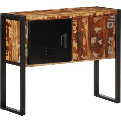 This wooden console cabinet is a perfect addition to your bedroom, living room, or office, creating a lasting impression! Robust and stable material: Solid reclaimed wood consists of reused timbers such as teak, mango wood, pinewood, and beech. These materials are recycled from old buildings such as factories, sheds, and boats. Signs of wear and visible grain structure give each piece its own history and a unique look.Ample storage: The side cabinet has 2 doors, providing enough storage space for you to keep various daily essentials organised and within easy reach.Displaying function: The tabletop of this hall cabinet is perfect for displaying your decorative items, picture frames and potted plants.Practical doors: Keep your essentials free from dust by hiding them behind the doors.Metal feet: The metal feet of the side table ensure sturdiness and stability. Warning:To prevent it from tipping over, this product must be used with the provided wall attachment device. Good to know:Each item is unique with variations in colours and grains. The delivery is random, ensuring the exclusivity and individuality of your product.