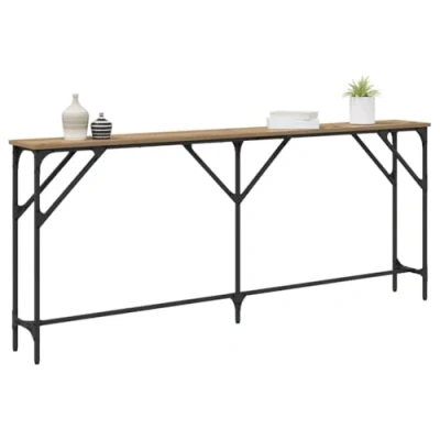 ManoManoGeneral description This Industrial Console Table combines stylish urban aesthetics with robust functionality, perfect for those who appreciate a blend of form and function. Its industrial-inspired design features a rectangular shape crafted from durable materials, offering a chic display for the living room. Positioned against any wall, this console table creates a striking focal point with its blend of iron and engineered wood. Use it to exhibit your favorite décor or as an additional storage solution in any living space, enhancing both style and utility. Technical specifications Colour: Artisan oak Material: Engineered wood and metal Overall dimensions: 180 x 23 x 75 cm (L x W x H) Weight: 8.6 kg Frame material: Iron Indoor / outdoor: Indoor use only Assembly required: Yes EAN: 8721288518316 SKU: 871327 Stability Features Equipped with adjustable levelers for stability on uneven surfaces. Easy Care Assembly requires two people and basic tools like a screwdriver. To maintain the
